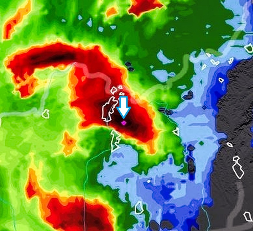 ...de nem emlékszem, hogy ilyet láttam volna, ráadásul ilyen brutális méretben, valaha is radarképen...Verőce-Szokolya irányából egyetlen óriási észak-északkelet-keleti ívbe fejlődött ki Bercelig, sőt majdnem vissza Gödöllőig, miközben az ív teteje majdnem Gyarmatig ért fel...elképesztő...(a nyíl kb. Kóspallag helye)....és még két hullám vonul át..igaz azok, egyre jobban keletre tolódnak a Mátra irányába...