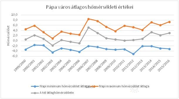 Összehasonlítva a 100 évvel ezelõtti telek átlaghõmérsékletét téli és fagyos napjainak számát az utóbbi 17 tél adataival, azt figyeltem meg, hogy jelentõsen enyhült teleink idõjárása. 1901-1950 pápai téli átlaghõmérséklete +0,1°C, és 1999-2016 átlaga pedig +1,2°C. A téli napok száma ugyanezen idõszakokban 24-rõl 18-ra, a fagyos napok száma 84-rõl 55-re csökkent.