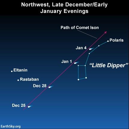 2. Mivel az üstökösmag viszonylag nagy méretû, és napközelben hatalmas sebességgel (400 km/s) halad, valószínûbb, hogy az extrém forróságban sem párolog el teljesen. Mit láthatunk az égen ebben a szerencsés esetben? Az üstökös legnagyobb fényességét (ami a Vénuszéval, esetleg a Holdéval is vetekedhet) a napközelség idején éri el. Ám ekkor a napkorong szomszédságában, a világos égbolton láthatnánk, bajos lenne tehát észrevenni. Decemberben, a Naptól távolodóban viszont heteken át fényes, hosszú csóvával díszítheti egünket. December elsõ felében a hajnali órákban, közvetlenül világosodás elõtt lesz érdemes megfigyelni a keleti égbolton. Megrögzött késõn kelõk december 10. körül már az esti sötétedés után, a nyugati égbolton is elcsíphetik, ám este a horizonthoz közelebb látszik majd, viszonylag hamar lenyugszik, és a Hold fénye is gyengítheti a látványt. A hónap vége felé viszont már egész éjszaka látható lesz a halványodóban lévõ, de remélhetõleg nagyméretû csóvát mutató üstökös, ami december 26-án kerül „legközelebb” (kb. 70 millió kilométerre) a Földhöz. Az üstökös látszó égi helyzetét az alábbi ábrák mutatják. (Balra: hajnalban, jobbra: este. Forrás: www.earthsky.org.)