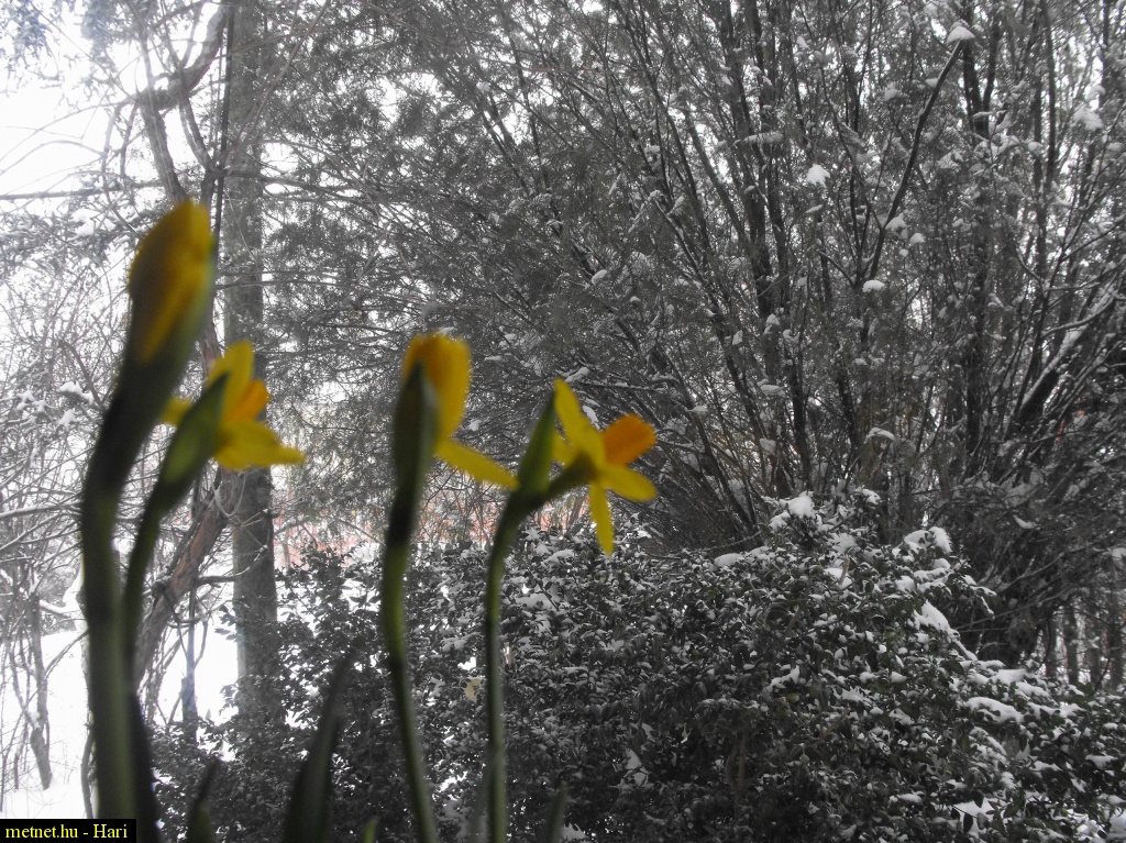 | Leírás: Nárciszok "nézik" bentrõl a havas kertet. | |