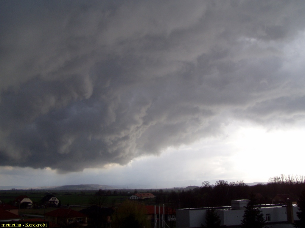 Leírás: Igen látványos volt a cella átvonulása. Dörgés, villámlás nem kísérte, kb. 2 percig borsószemnél apróbb, lágy jeget adott, vízzel. Az érkeztekor volt egy átmeneti szélerõsödés, az élénk kategóriát nem érhette el. 3-4 mm csapadékot adott. A forgó mozgása látványos volt.