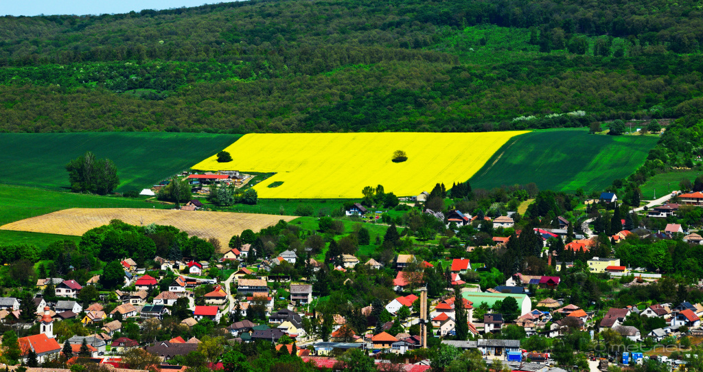 | Leírás: Kilátás a Gerecsében Tardos mellett egy kilátópontról, távoli repceföldekkel | |