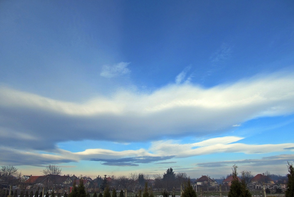 | Leírás: Altocumulus lenticularis (Ac len), Lencse vagy mandula alakú középszintû gomoly vagy párnafelhõ. | |