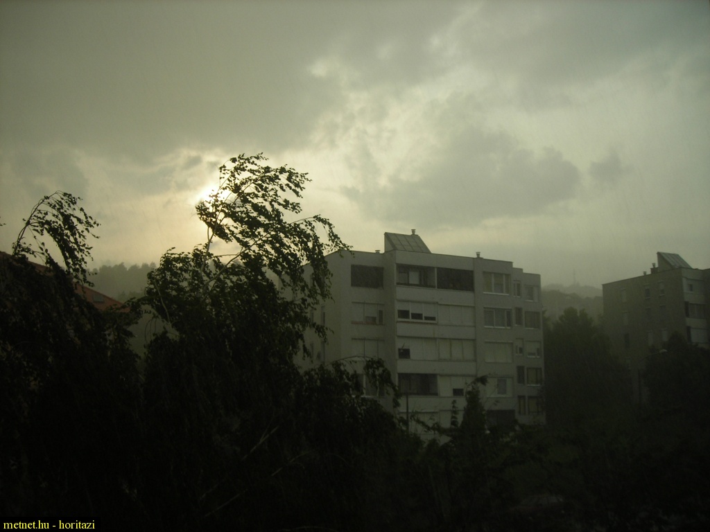 | Leírás: Város déli részén tevékenykedõ,felhõszakadás intenzitású záporesõ,kevés jéggel,erõs zivatar tevékenységgel. | |