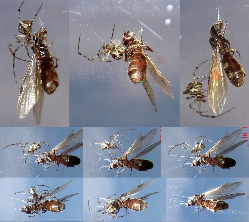 Leírás: Véletlen kinéztem a konyhaablakon és abban a pillanatban ragadt pókhálóba a szárnyashangya. A pók odarohant, tette a dolgát, a királynõ rövid ideig vergõdött. A gép éppen kéznél volt. Kicsit lágy a sorozat mert az ablakon kívül zajló eseményt dupla üvegen át vakuval fotóztam. (A pók mászkált rajta közben forgatta, így több oldalról fotózhattam. Az áldozat végig függõleges helyzetben volt, a kisebb képeket én fektettem el helyszûke miatt)
