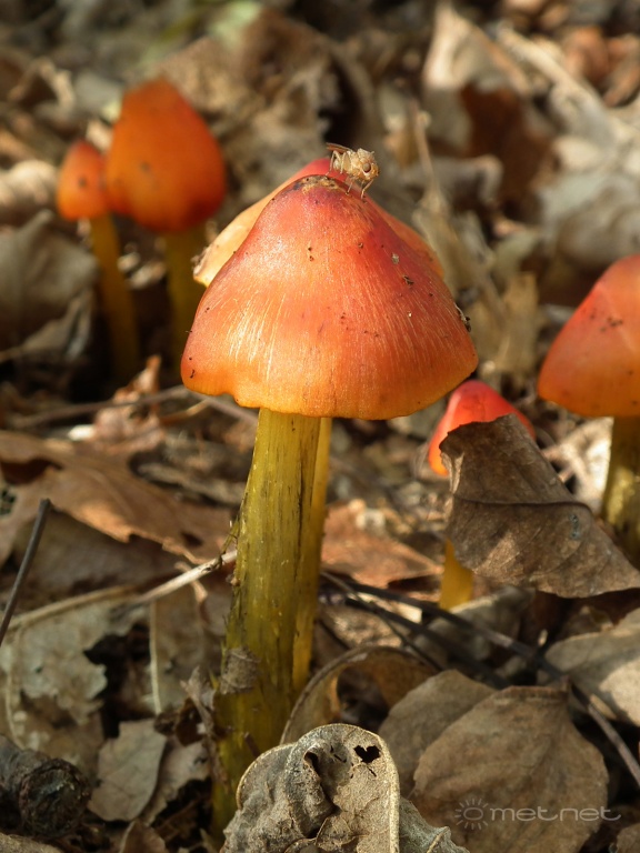 | Leírás: Kúpos nedûgomba (Hygrocybe conica). Csúcsán gombalégy-szerûség pihent meg éppen. | |