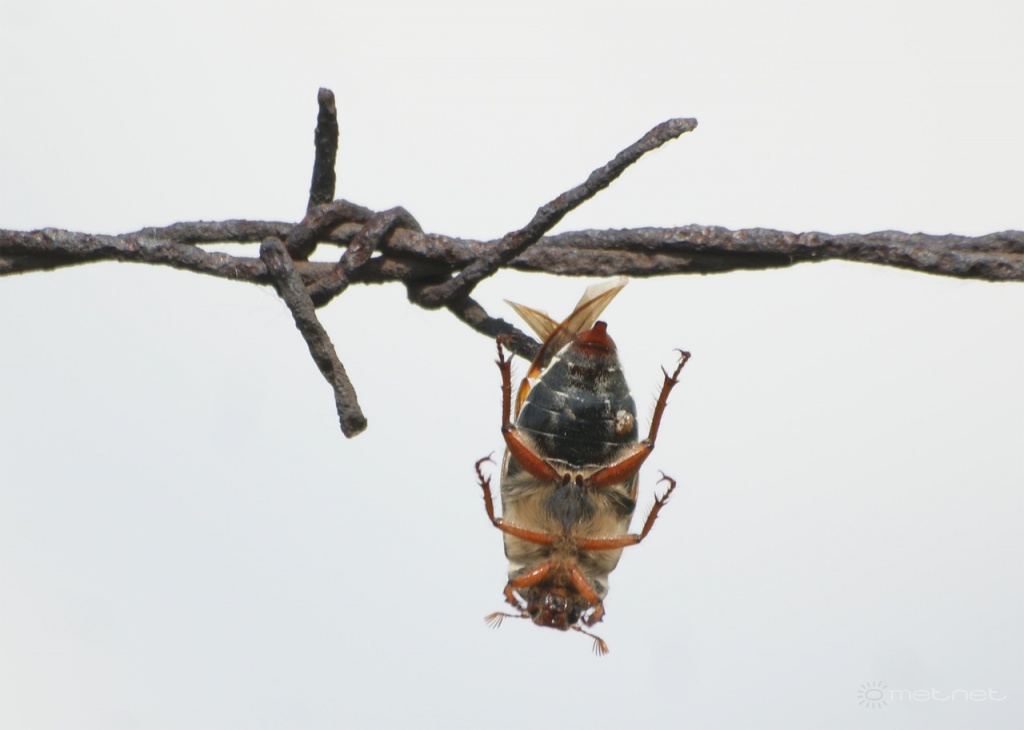| Leírás: Cserebogár szögesdróton - vagy öngyilkos lett, vagy egy tövisszúró gébics bökte fel. | |