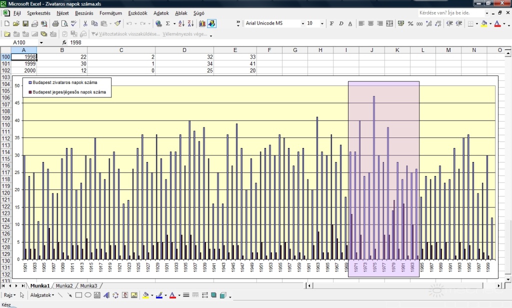 Leírás: Jeges és zivataros napok száma a XX. században Budapesten (forrás: OMSZ adatok)