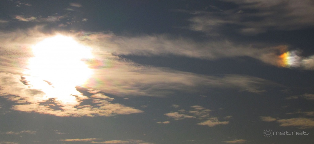Ebben az évben sajnos a "megszokottnál" ritkábban láttam említésre méltó légköroptikai jelenséget. Ma, késõ délután kipillantok az ablakon, látom hogy egy szép és erõs melléknap virít a Nap mellett. Mire elõkerítettem a gépet, azalatt eltûnt. Azért leballagtam a kert másik felébe, hátha esetleg megjelenik még a Nap másik oldalán, néha megesik. Hiába várakoztam. Közben felnéztem az égre és megláttam a fejem felett "az Ég mosolyát"
