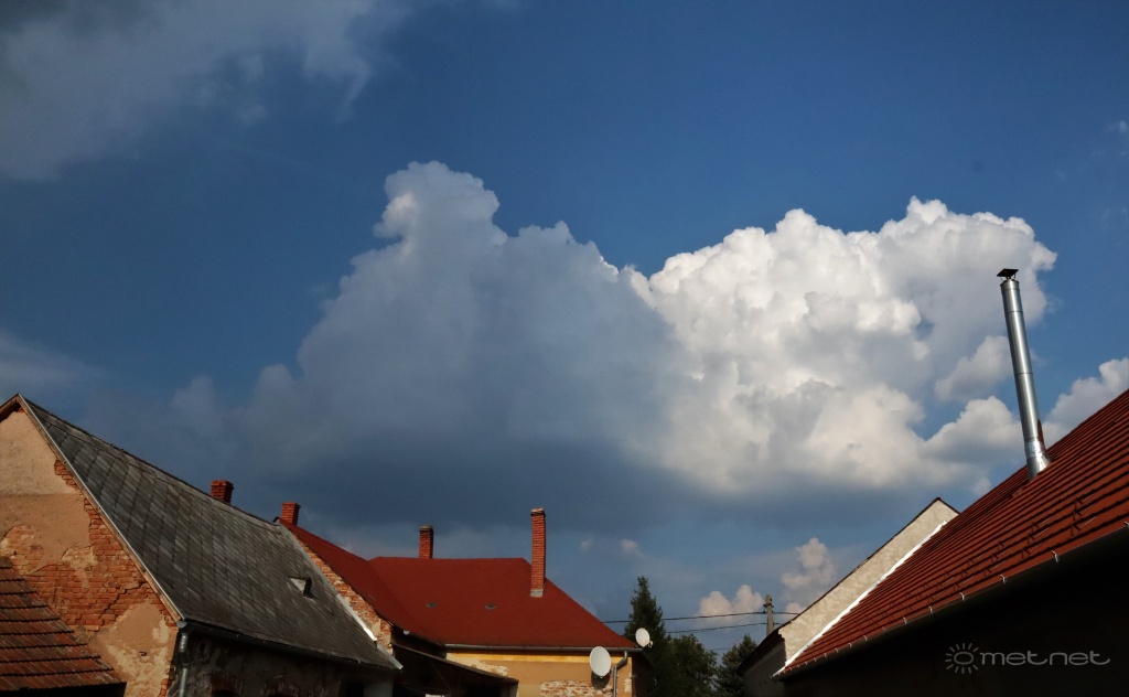 Bizony, szépen jön a várt zivataros zóna, itt is volt már pár percnyi záporka, amit egyetlen dörgés előzött meg. Most is délre próbálkozik a légkör, méretes tornyok emelkednek, de azért eléggé száraz a levegő, szóval egyelőre tiszavirág életű cellák ezek. Talán még később..