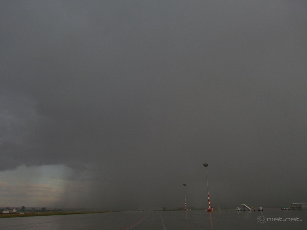 Tegnap is megkaptuk a magunkét a reptéren. Este 6 körül elkezdett hatalmas cseppekkel együtt borsónyi jég esni. Majd 5 perc múlva Vecsés, Üllő környékén leszakadt az ég. Nagyon sötét és sűrű csapadékfal alakult ki pár perc alatt. Nálam ezúttal csak 4 mm esett. Egy kép: Link