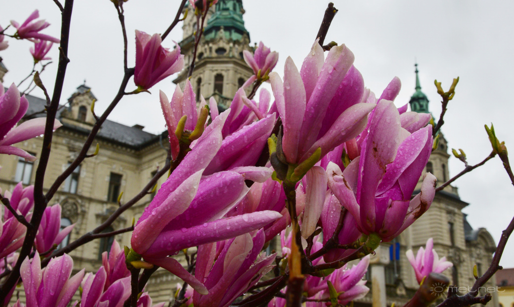 | Leírás: Virágzó tulipánfa Győr belvárosában borult, esős időben | |