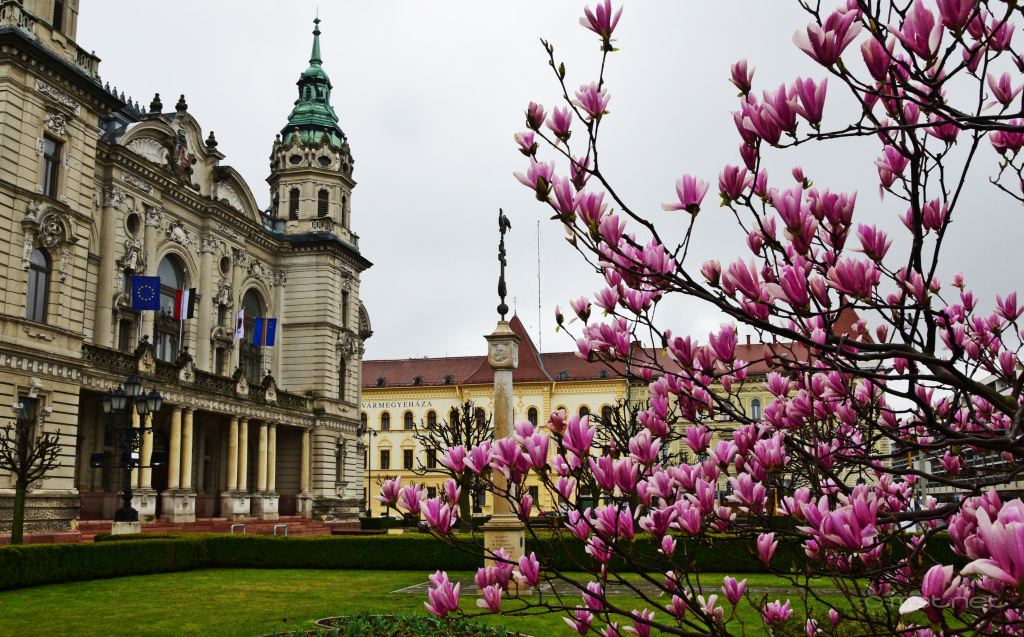 | Leírás: Virágzó tulipánfa Győr belvárosában borult, esős időben | |
