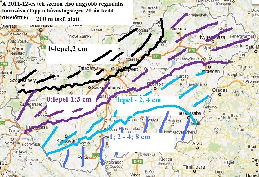 | Leírás: Több modell alapján így tippelem (!) az elsõ nagyobb területre kiterjedõ regionális havzás eredményét kedd délelõttre. Egy biztos nem így lesz.:) Elnézést a csapnivaló "grafikai" megjelenítésért, de talán azért értelmezhetõ. |