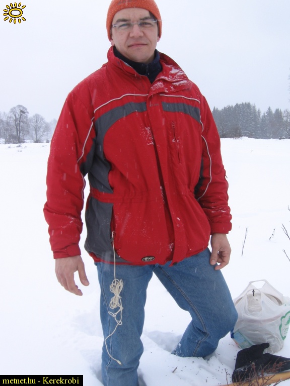 | Leírás: Bükk-fennsík; igazi tél. Képen Kocka észlelõtársunk látható. |