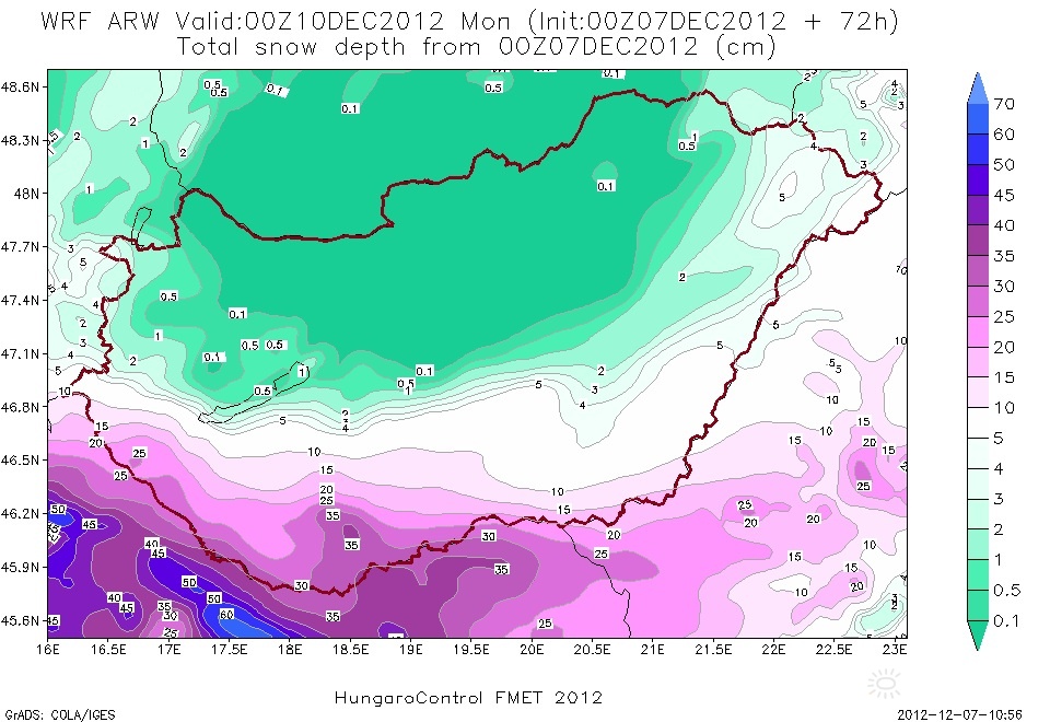 | Leírás: A WRF 2012.12.07. 00:00-ás analízisbõl készült futása a hétvégi havazásból várható friss hóréteget mutatja. | |