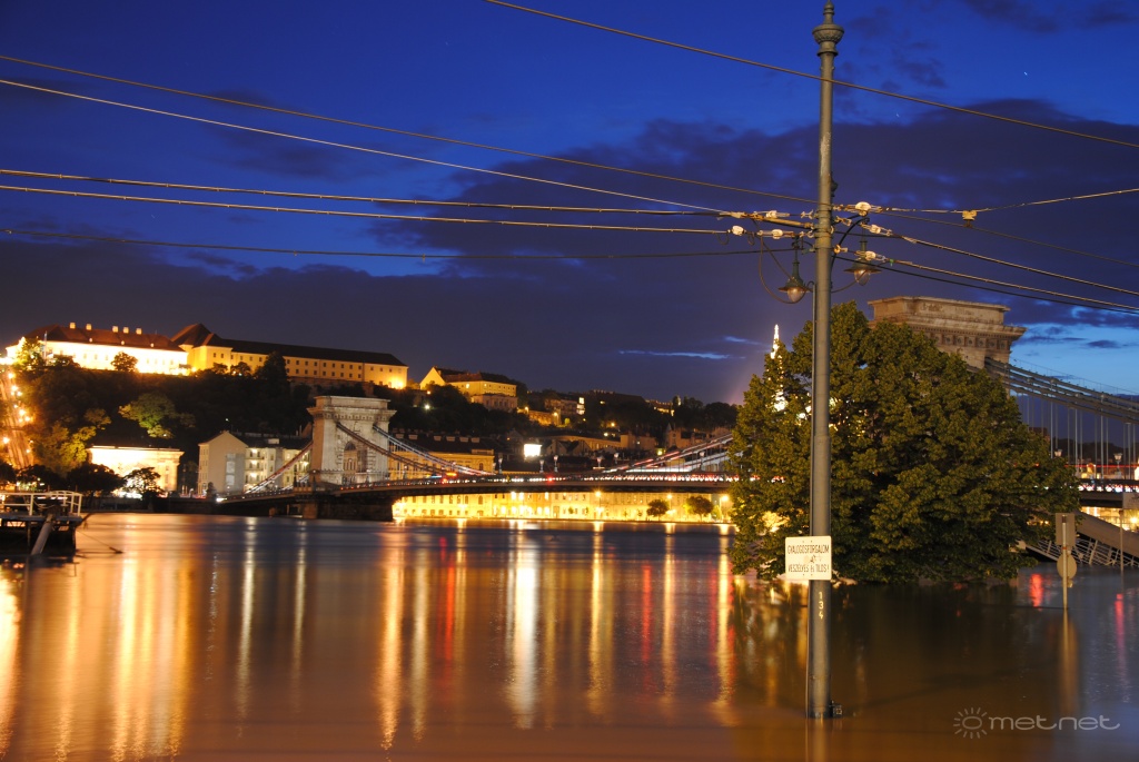 | Leírás: Az áradó Duna és a díszkivilágítás nélküli Lánchíd. | |