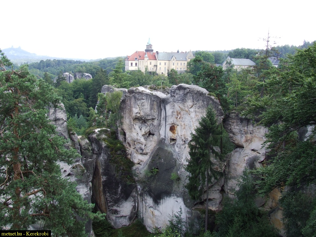 | Leírás: Hruba Skala; a Cseh-paradicsom/ Cesky-Raj homokkõ sziklái. Kilátás az egyik szikla tetejérõl a kastély; valamint Trosky vára felé, Ny-i irányba. | |