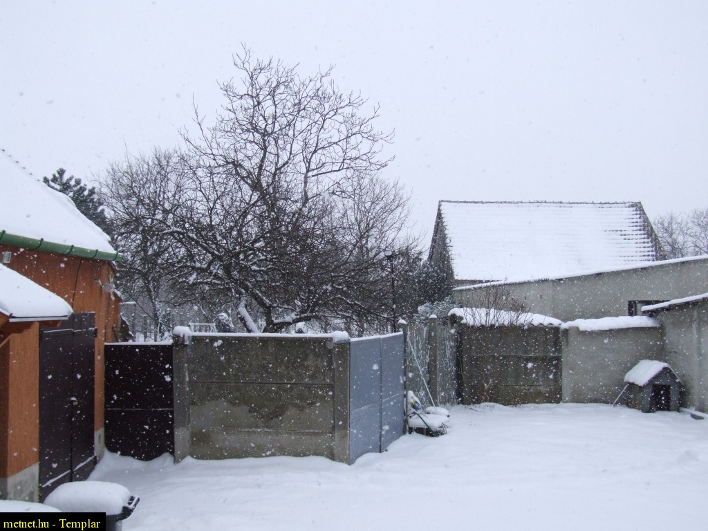 | Leírás: Hetedik órája havazik, 11 cm. Az északias szél munkája látható a tetõn is. | |