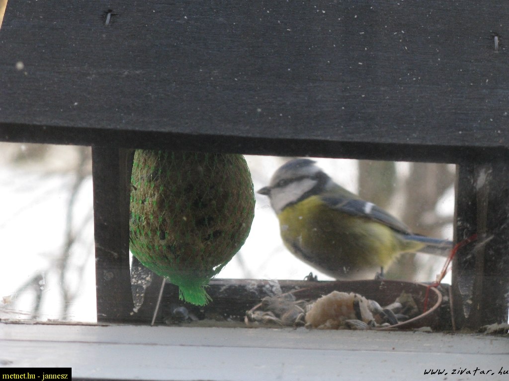 Leírás: Kékcinege a konyhai etetõben. A kép ablak mögül készült, mozgásérzékelõs CHDK scripttel.