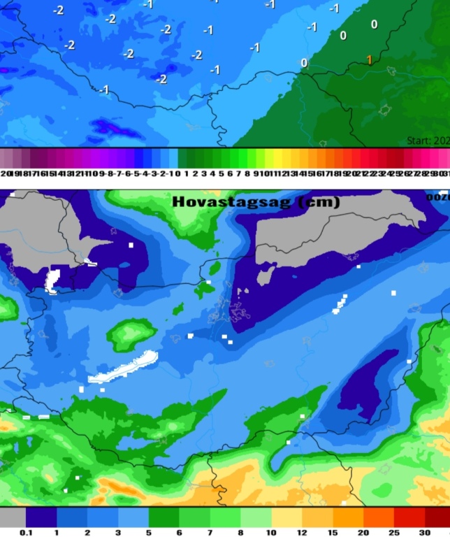 Hétfőn este melegfront érkezik, ami főként északra és keletre hoz csapadékot, zömében havat, de előfordul majd vegyes halmazállapotú csapadék is.