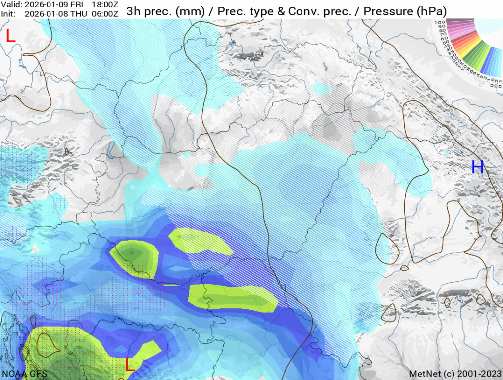 Hétfőn este melegfront érkezik, ami főként északra és keletre hoz csapadékot, zömében havat, de előfordul majd vegyes halmazállapotú csapadék is.