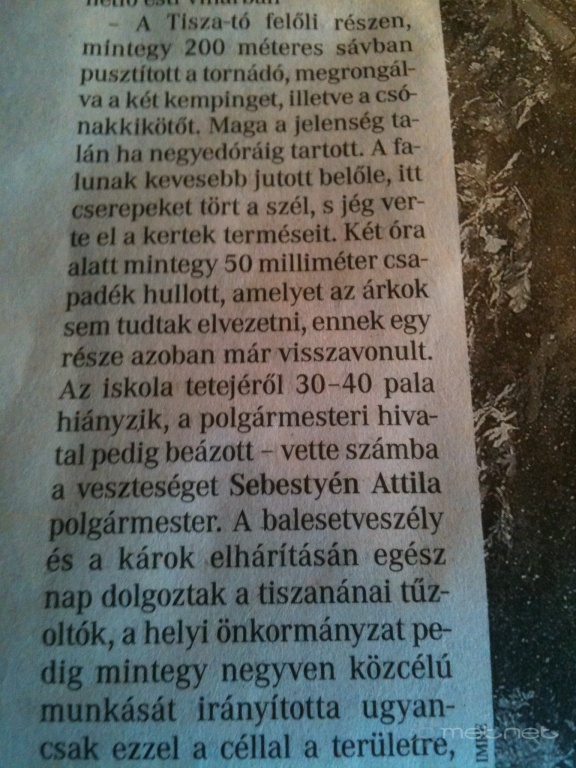 Leírás: Cikkdokumentáció a sarudi tornádóról. Forrás: Heves Megyei Hírlap. Felhasználás célja: tudományos dokumentációs cél