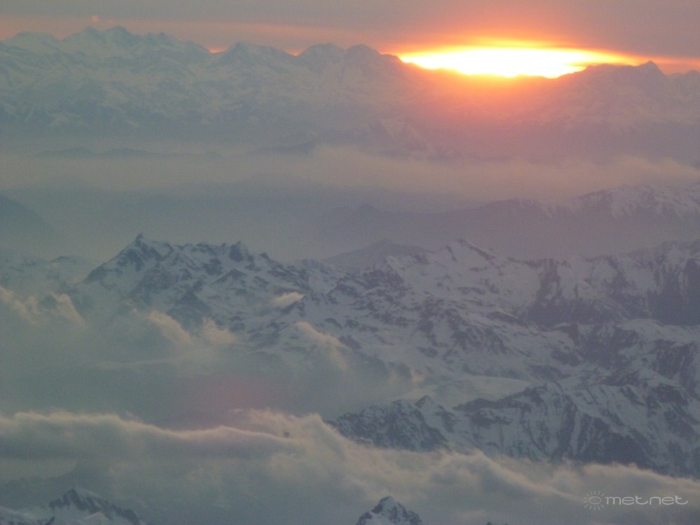 | Leírás: Napnyugta a Nyugati-Alpokban, 9000 méterrõl fényképezve, az olasz-svájci határ közelében. | |
