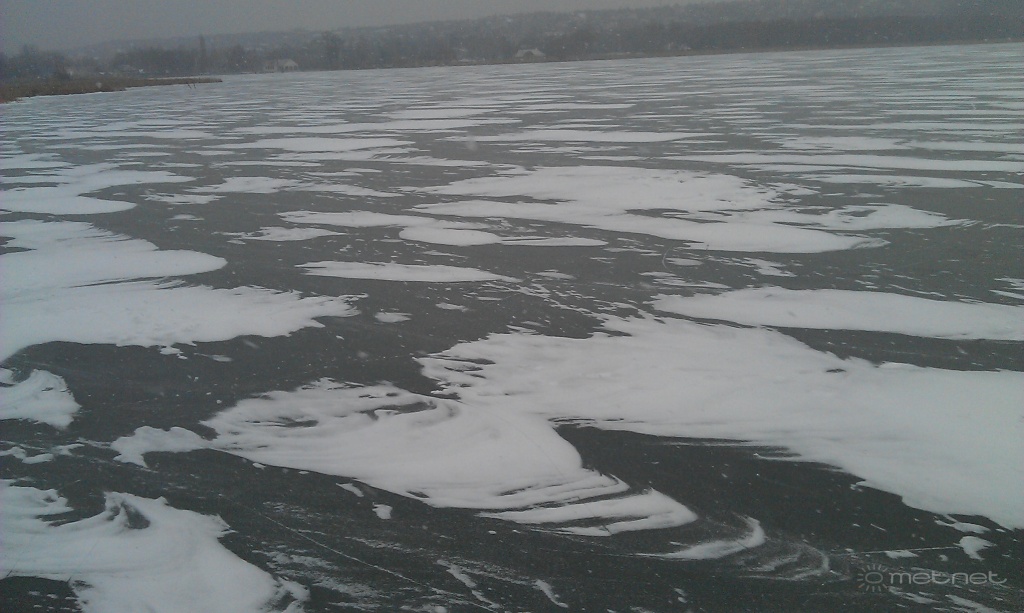 Leírás: A Balaton jege kb. 10 cm vastag, a szél nagyrészt elfújta a kb. 6 cm-es havat. A jég tökéletesen tükör sima, a hószigetek is korcsolyázhatók a porhó nem fagyott rá a jégre. A Tubruki strandtól kb. 200 méterre készült a kép.