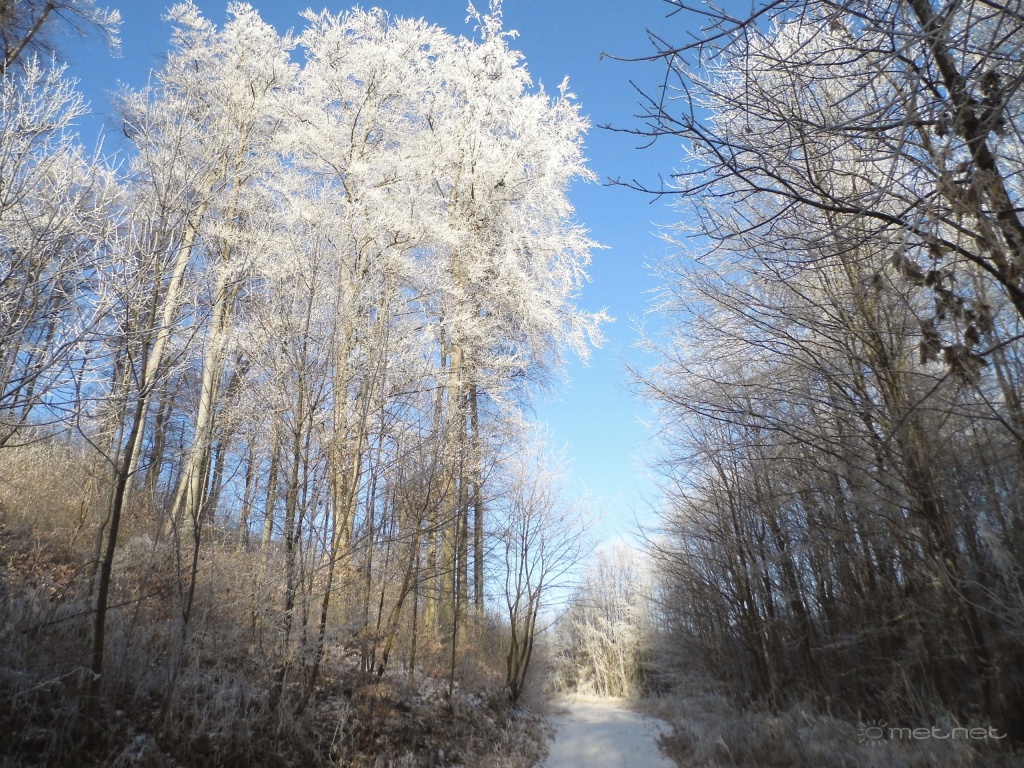 | Leírás: A Diósgyõr feletti zúzmarás erdõ reggeli napfényben | |