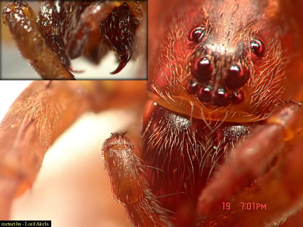 | Leírás: Vadászó pók macska karmára emlékeztetõ csáprágói (chelicera) Nyugalmi helyzetben párhuzamosan "összecsukva" mint két nagy szemfog áll ki a pók "szájából" (hasonló kép a Képtárban) | |