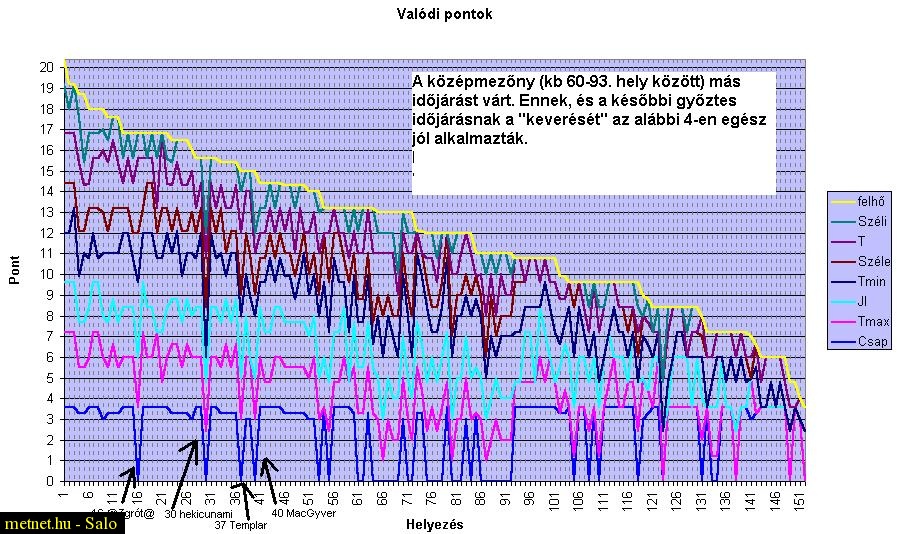 | Leírás: Aktuális forduló: Sopron (20091109). A grafikon a különbözõ paraméterket egymásra halmozottan mutatja. Alul vannak a nagyobb mezõnyátlagot adó paraméterek. Adott elõrejelzõnél az eltérõ taktika a grafikon vágásszerû képében mutatkozik, mivel õ másra kapott sok pontot, mint a körülötte lévõk. |
