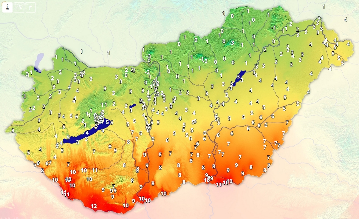 Északon 0 és 1 fok között a hőmérséklet, ezzel szemben délen 10 és 12 fok közötti értékeket mérnek.